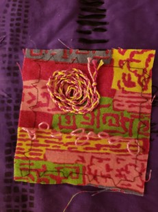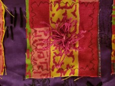 These are close-ups of the decorated squares. On the top, I rolled the fabric and tied it with a red & yellow thread. At the bottom, I covered a washer with yellow embroidery thread and then crossed it with red. You can also see from the close-ups I was playing with my sewing machine and was using different stitches to sew the squares to the background. I don’t really like most of the stitches on my machine.